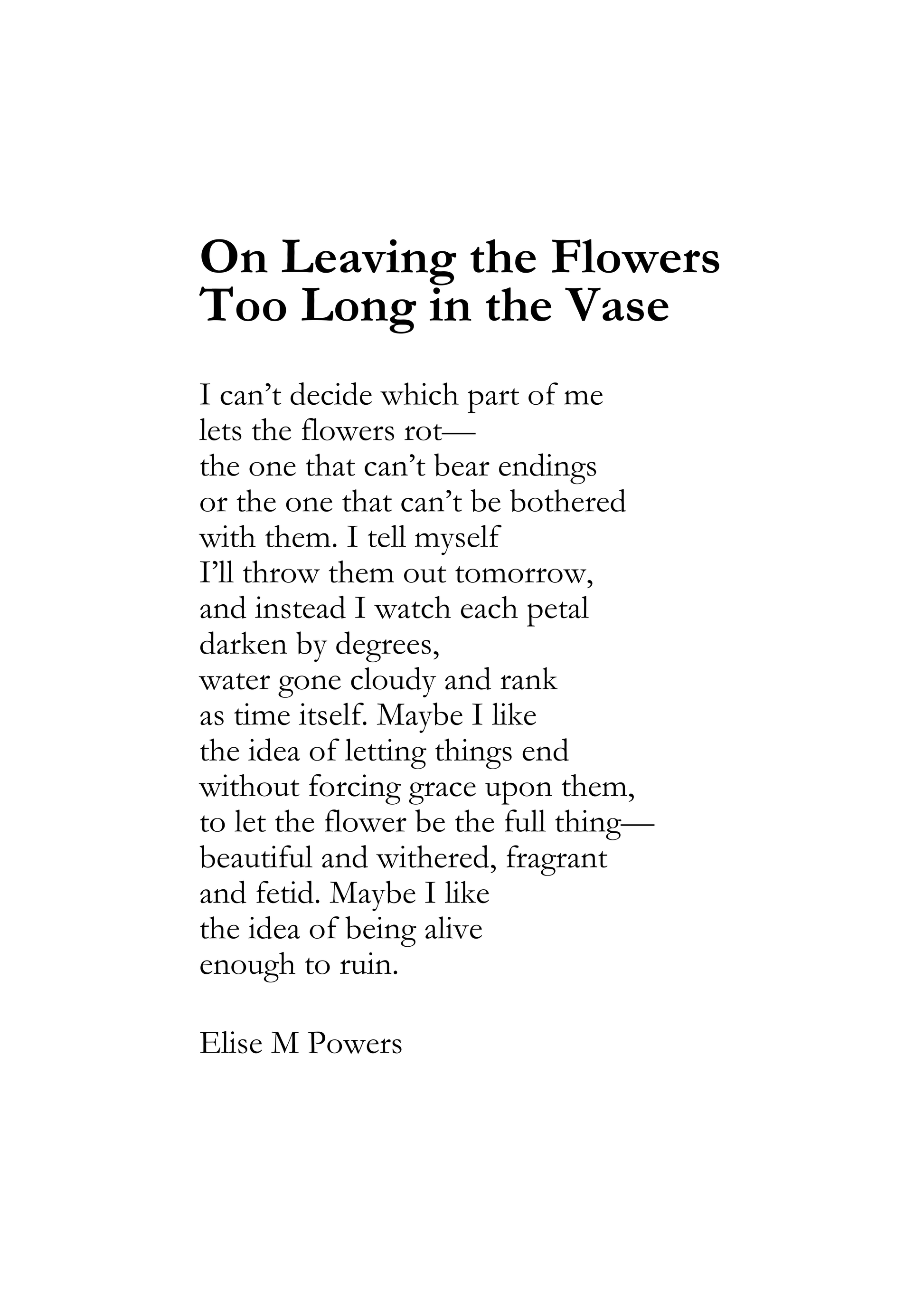 - 5×7 poetry print of “On Leaving the Flowers Too Long in the Vase” by Elise M Powers