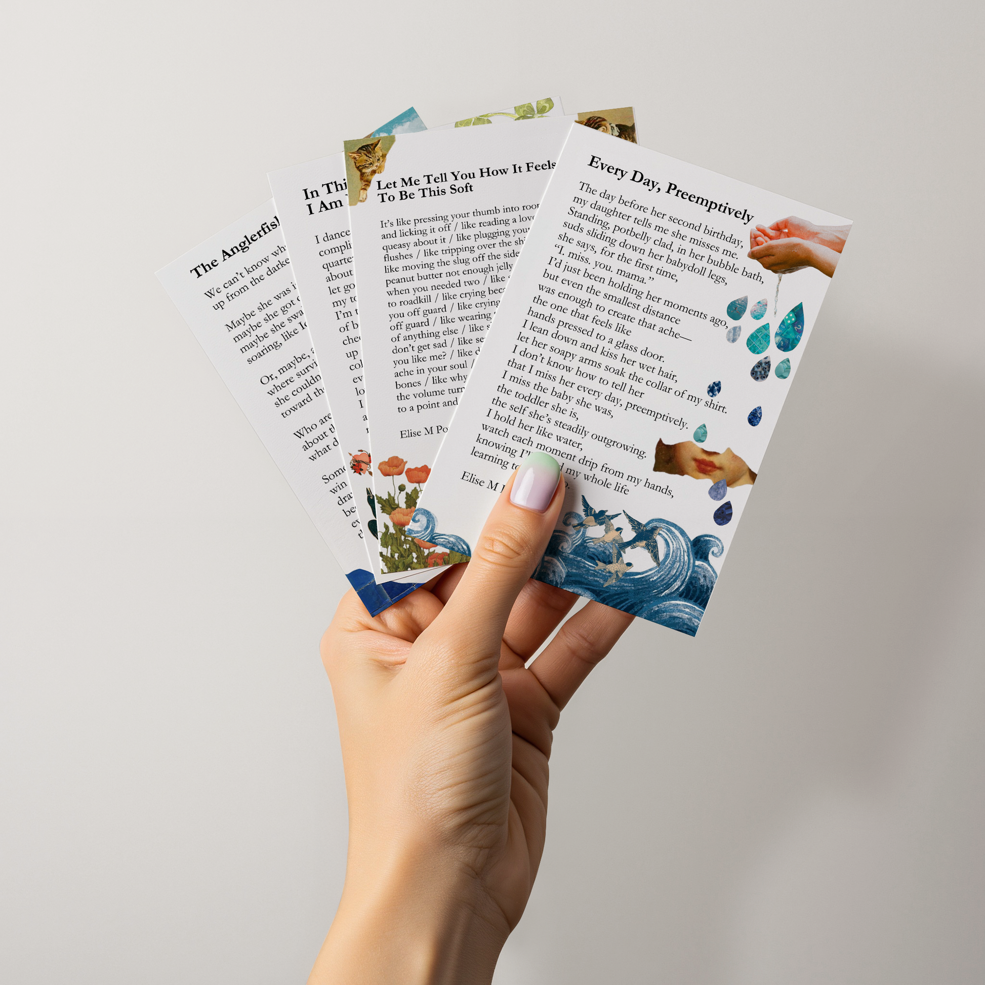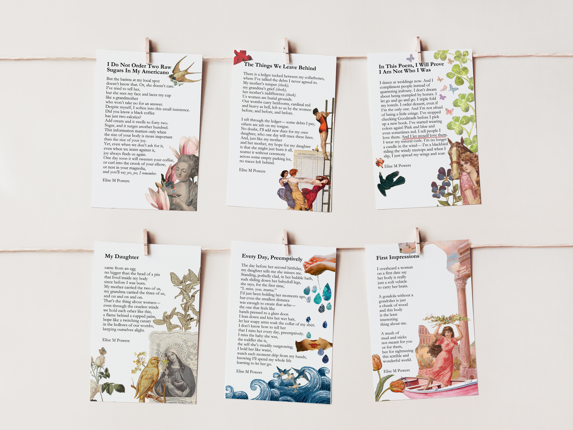 Each postcard is printed on thick, high-quality cardstock and features accompanying collage art that brings the poem to life.