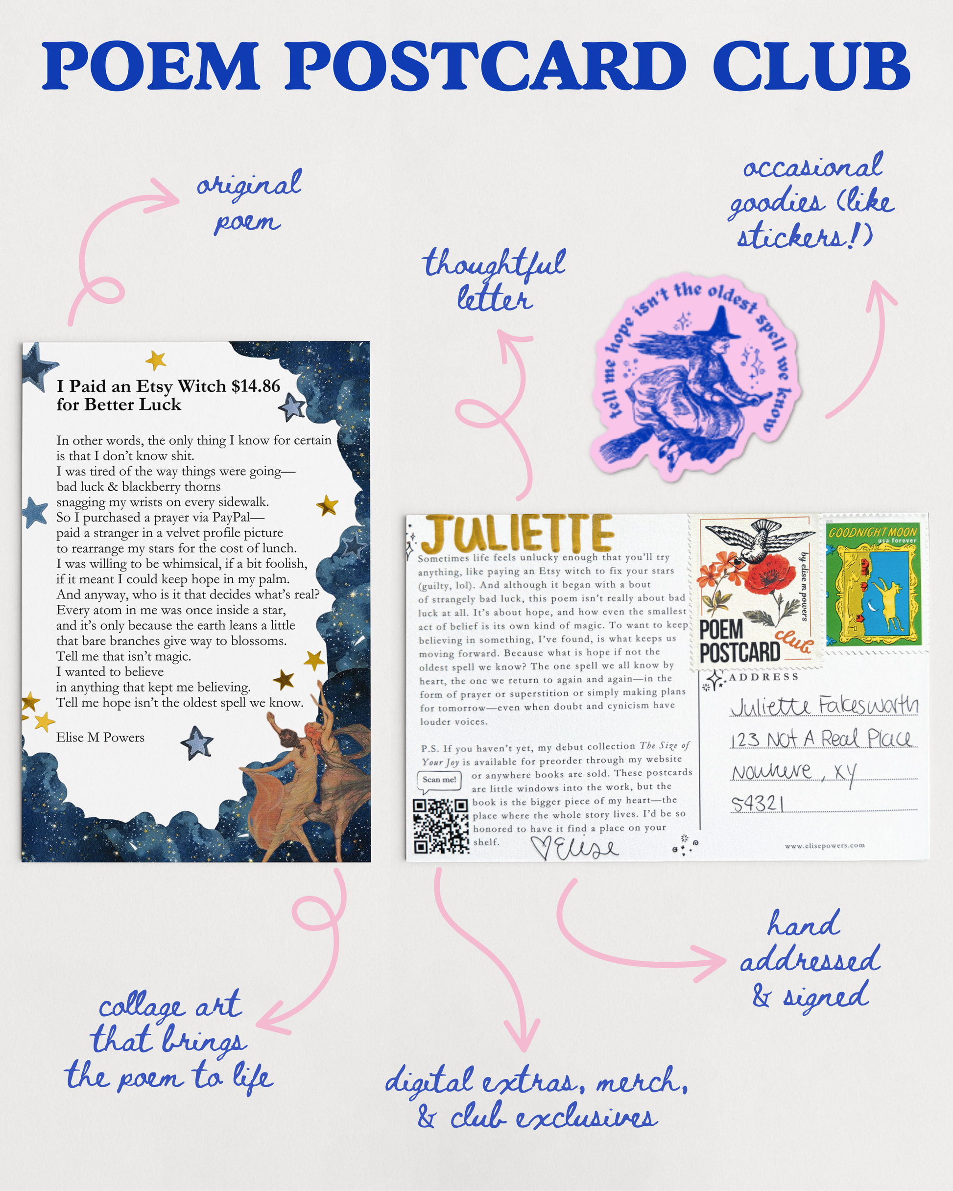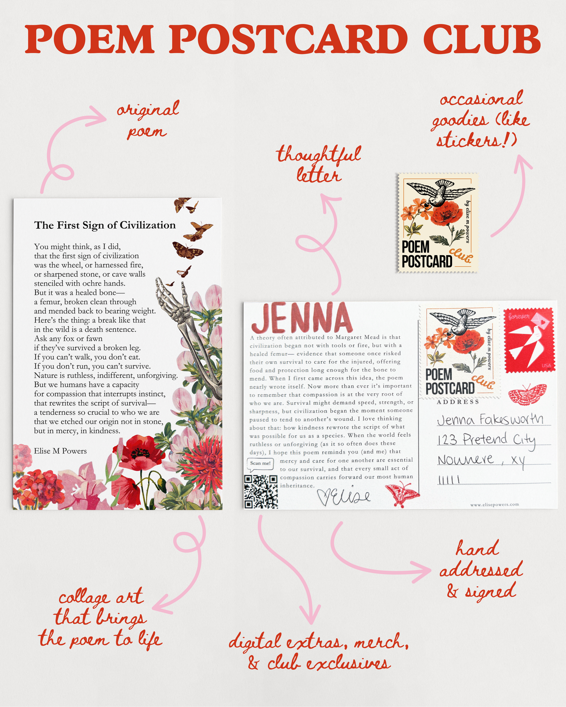 Elise’s Poem Postcard Club is food for the soul. 🫶🏼 Receiving her postcards is like stepping back to simpler times where snail mail was preferred but her words speak not only to a younger you, but to who you are healing into. Her poems are dawned with beautiful words and imagery alike, and the PPC makes you feel a part of a community of others who cherish the written word. Try it out & you’ll soon realize you can’t wait for her poetry to arrive every month!! 💗
