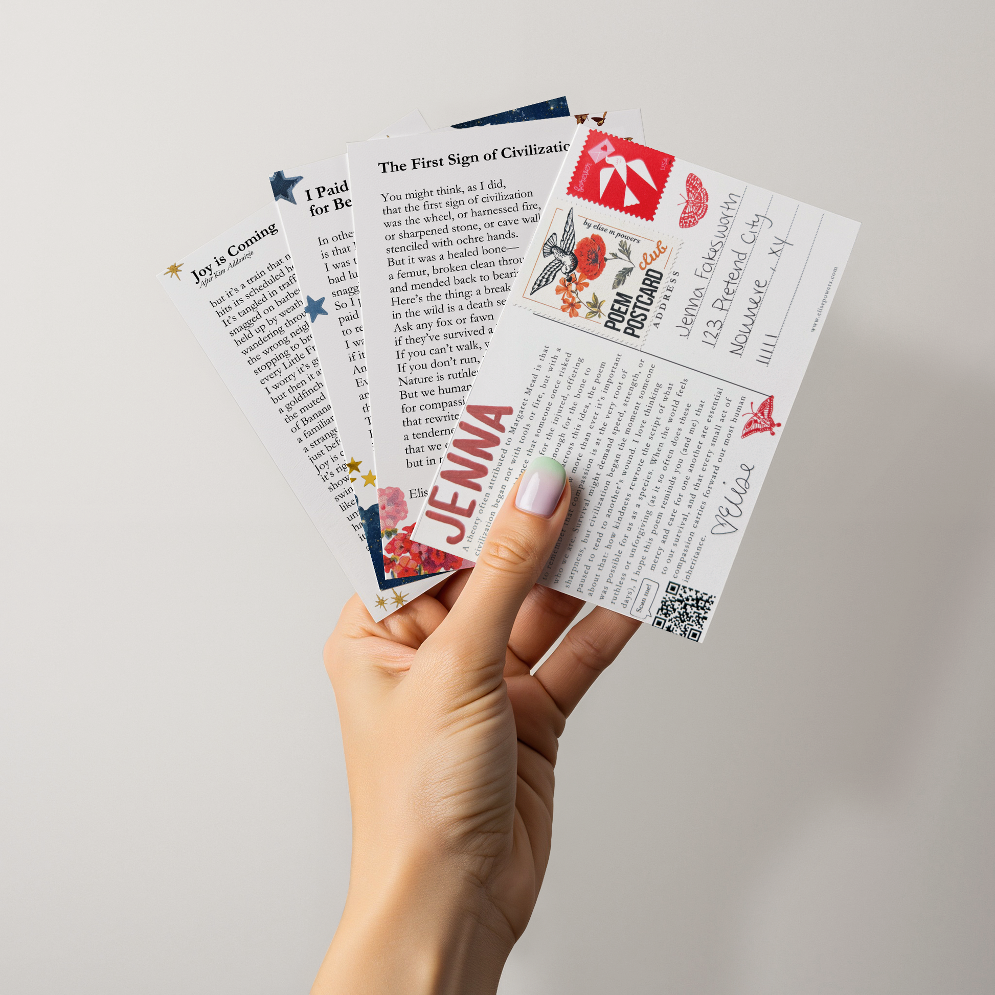Expect more than just a postcard: from time to time, I’ll slip in a bonus (think: stickers, journal prompts, and more). Each postcard also carries a QR code that leads you to a downloadable 5x7 print of the poem, along with other Poem Postcard Club exclusives.