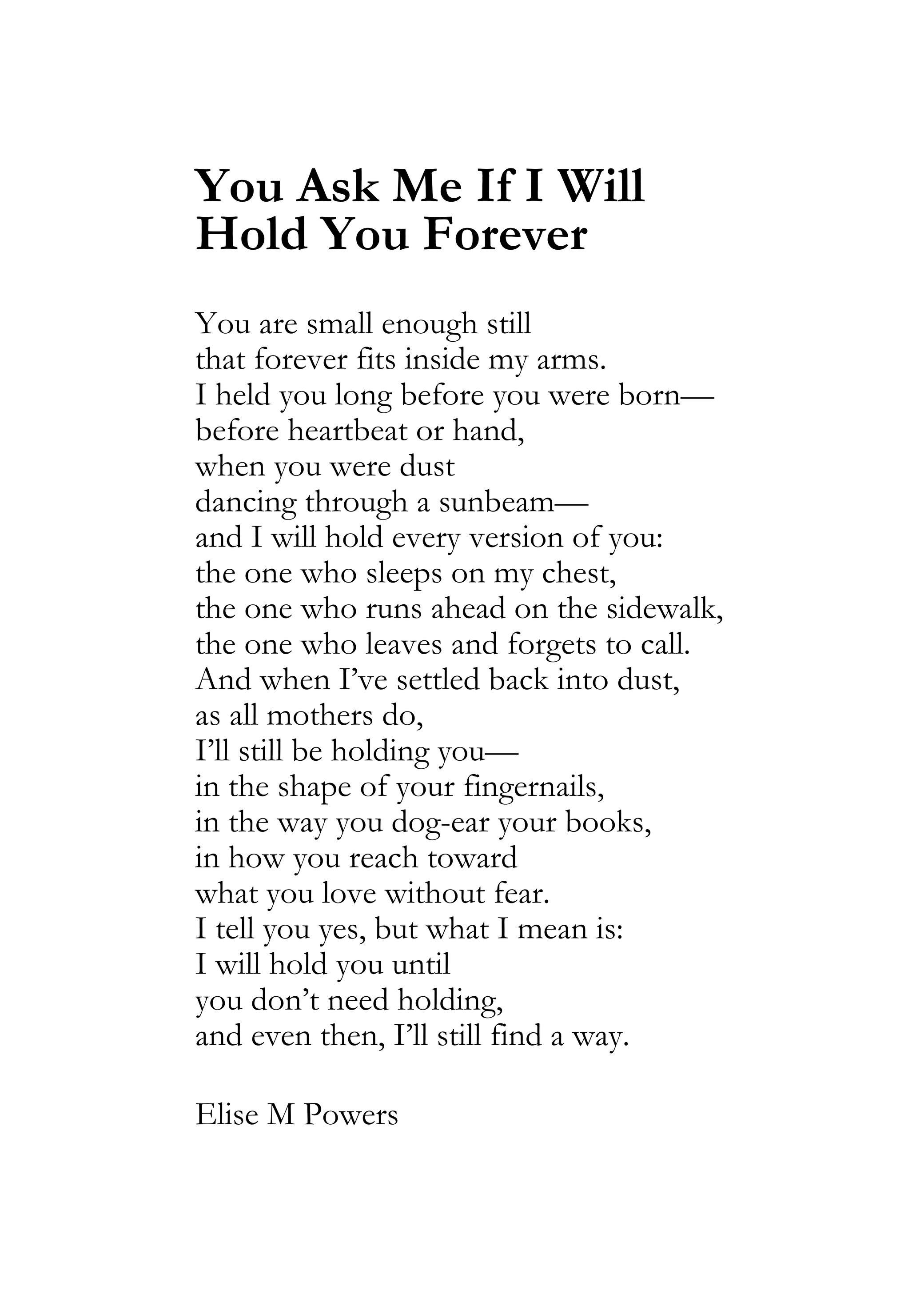 - 5×7 poetry print of “You Ask Me If I Will Hold You Forever” by Elise M Powers